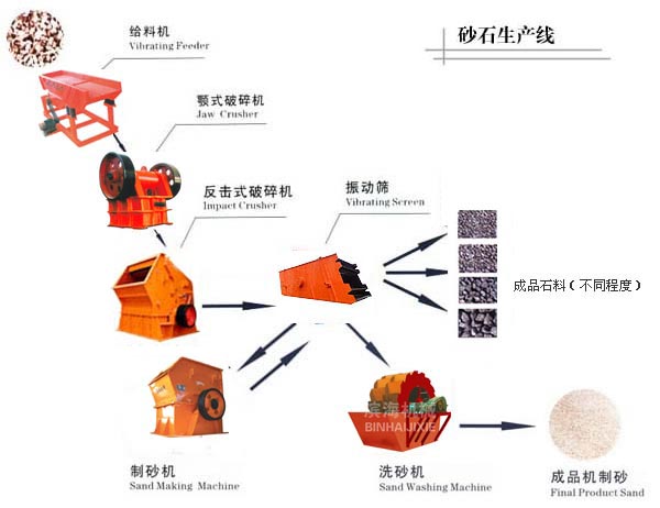 石料由振动给料机均匀地送到颚式破碎机进行粗破,粗破后的物料由胶带输送机送入到制砂机进行进一步破碎,细碎后的物料被输送到振动筛进行筛分,达到成品粒度要求的物料被送入洗砂机清洗,清洗后由成品输送带输出即为成品;未达到成品粒度要求的物料从振动筛返回制砂机重新加工,形成闭路多次循环。成品粒度可按用户的需求进行组合和分级。如果选用干法生产工艺,可配备粗细粉分离机和除尘设备。