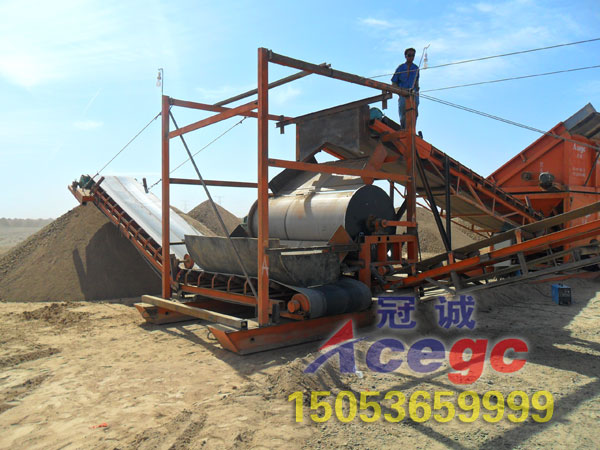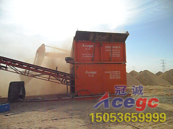 卧式干选机分两种,一种是带尾料输送杆的,采用一台装载机上料,废料用尾料输送杆输送出去,使用于4米左右沙层,上料高度为3.7米,装载机可以直接上料不用助坡。另外一种是不带尾料输送带,尾料用装载机清除走,整机要用两台装载机,上料高度为3.7米,装载机可以直接上料不用助坡。整机用电45kw.2