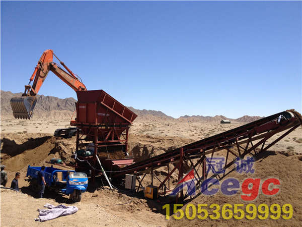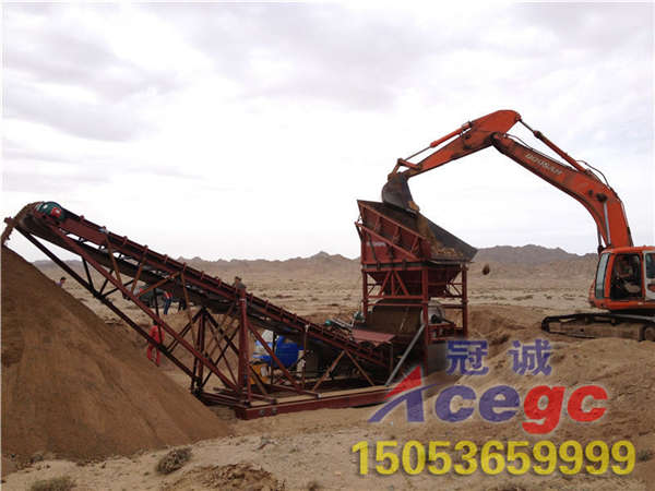 特种干选机采用挖掘机上料,废料用输送杆输送走,使用于3米左右沙层,上料高度为4.5米,装载机可以直接上料不用助坡。整机用电量为45kw左右。