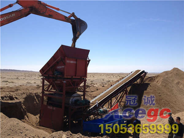 特种干选机采用挖掘机上料,废料用输送杆输送走,使用于3米左右沙层,上料高度为4.5米,装载机可以直接上料不用助坡。整机用电量为45kw左右。小时免费咨询电话:400 9949 111 手机:15053659999 15653473333